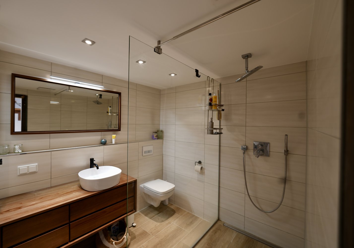 Über die Treppe gelangen Sie in das Obergeschoss, wo sich ein großzügiges Kinderzimmer, ein Schlafzimmer mit Klimaanlage und Balkon, sowie das modern gestaltete Badezimmer mit XXL-Dusche befinden.